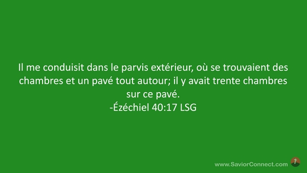 Il me conduisit dans le parvis extérieur, où se trouvaient des chambres et un pavé tout autour; il y avait trente chambres sur ce pavé. -Ézéchiel 40:17 LSG