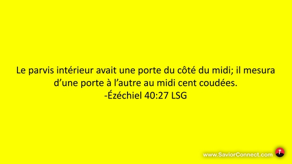 Le parvis intérieur avait une porte du côté du midi; il mesura d'une porte à l'autre au midi cent coudées. -Ézéchiel 40:27 LSG