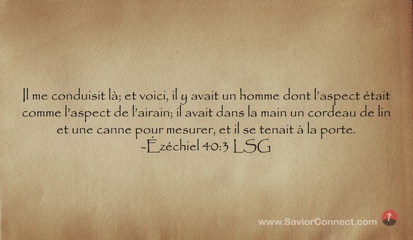 Il me conduisit là; et voici, il y avait un homme dont l'aspect était comme l'aspect de l'airain; il avait dans la main un cordeau de lin et une canne pour mesurer, et il se tenait à la porte. -Ézéchiel 40:3 LSG