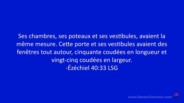 Ses chambres, ses poteaux et ses vestibules, avaient la même mesure. Cette porte et ses vestibules avaient des fenêtres tout autour, cinquante coudées en longueur et vingt-cinq coudées en largeur. -Ézéchiel 40:33 LSG
