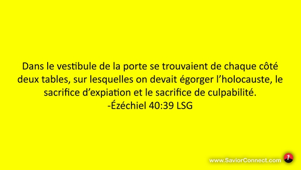 Dans le vestibule de la porte se trouvaient de chaque côté deux tables, sur lesquelles on devait égorger l'holocauste, le sacrifice d'expiation et le sacrifice de culpabilité. -Ézéchiel 40:39 LSG
