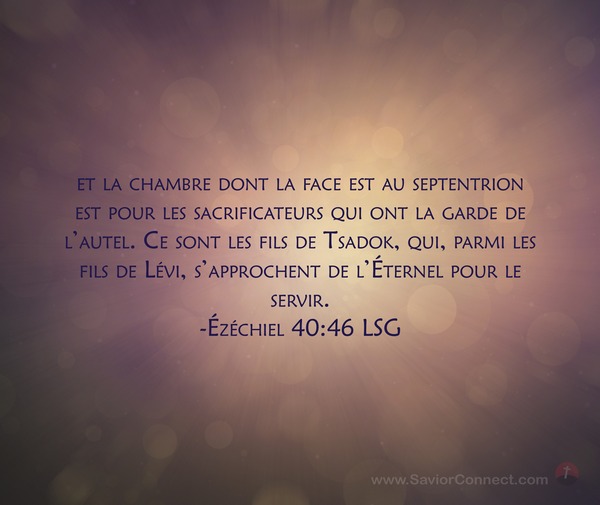 et la chambre dont la face est au septentrion est pour les sacrificateurs qui ont la garde de l'autel. Ce sont les fils de Tsadok, qui, parmi les fils de Lévi, s'approchent de l'Éternel pour le servir. -Ézéchiel 40:46 LSG