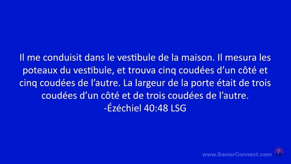 Il me conduisit dans le vestibule de la maison. Il mesura les poteaux du vestibule, et trouva cinq coudées d'un côté et cinq coudées de l'autre. La largeur de la porte était de trois coudées d'un côté et de trois coudées de l'autre. -Ézéchiel 40:48 LSG