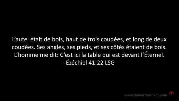 L'autel était de bois, haut de trois coudées, et long de deux coudées. Ses angles, ses pieds, et ses côtés étaient de bois. L'homme me dit: C'est ici la table qui est devant l'Éternel. -Ézéchiel 41:22 LSG