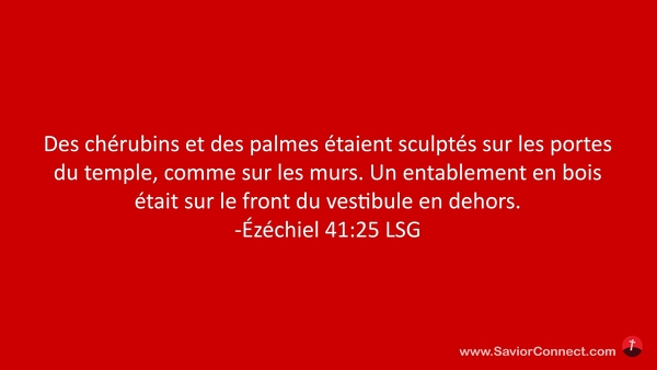 Des chérubins et des palmes étaient sculptés sur les portes du temple, comme sur les murs. Un entablement en bois était sur le front du vestibule en dehors. -Ézéchiel 41:25 LSG