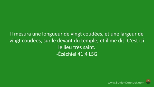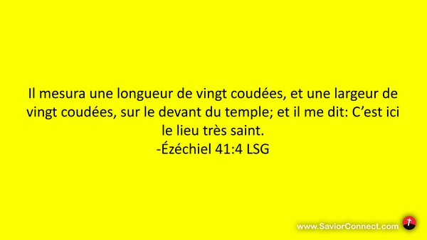 Il mesura une longueur de vingt coudées, et une largeur de vingt coudées, sur le devant du temple; et il me dit: C'est ici le lieu très saint. -Ézéchiel 41:4 LSG