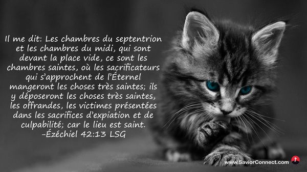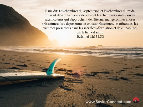 Il me dit: Les chambres du septentrion et les chambres du midi, qui sont devant la place vide, ce sont les chambres saintes, où les sacrificateurs qui s'approchent de l'Éternel mangeront les choses très saintes; ils y déposeront les choses très saintes, les offrandes, les victimes présentées dans les sacrifices d'expiation et de culpabilité; car le lieu est saint. -Ézéchiel 42:13 LSG