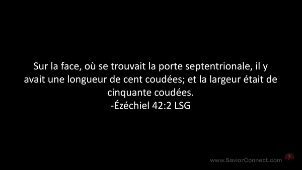 Sur la face, où se trouvait la porte septentrionale, il y avait une longueur de cent coudées; et la largeur était de cinquante coudées. -Ézéchiel 42:2 LSG