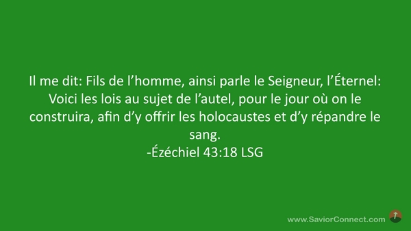 Il me dit: Fils de l'homme, ainsi parle le Seigneur, l'Éternel: Voici les lois au sujet de l'autel, pour le jour où on le construira, afin d'y offrir les holocaustes et d'y répandre le sang. -Ézéchiel 43:18 LSG