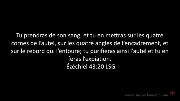 Tu prendras de son sang, et tu en mettras sur les quatre cornes de l'autel, sur les quatre angles de l'encadrement, et sur le rebord qui l'entoure; tu purifieras ainsi l'autel et tu en feras l'expiation. -Ézéchiel 43:20 LSG