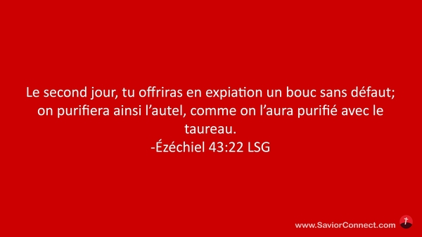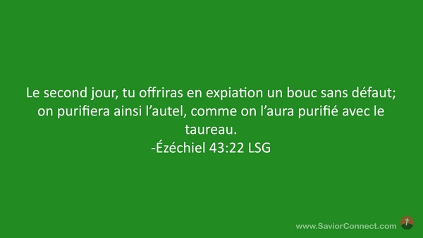 Le second jour, tu offriras en expiation un bouc sans défaut; on purifiera ainsi l'autel, comme on l'aura purifié avec le taureau. -Ézéchiel 43:22 LSG