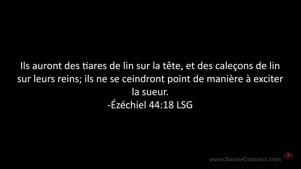 Ils auront des tiares de lin sur la tête, et des caleçons de lin sur leurs reins; ils ne se ceindront point de manière à exciter la sueur. -Ézéchiel 44:18 LSG