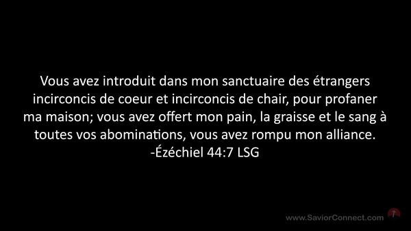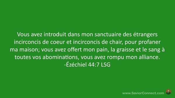 Vous avez introduit dans mon sanctuaire des étrangers incirconcis de coeur et incirconcis de chair, pour profaner ma maison; vous avez offert mon pain, la graisse et le sang à toutes vos abominations, vous avez rompu mon alliance. -Ézéchiel 44:7 LSG
