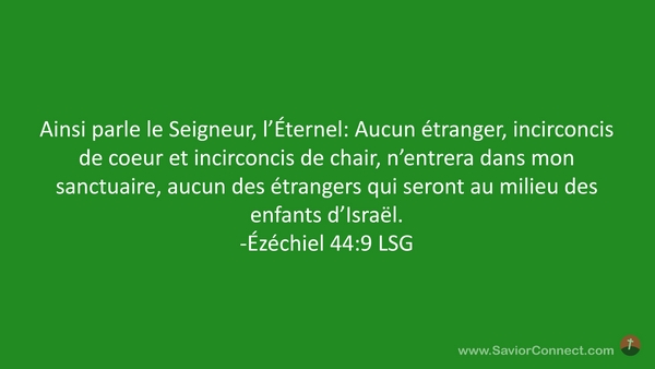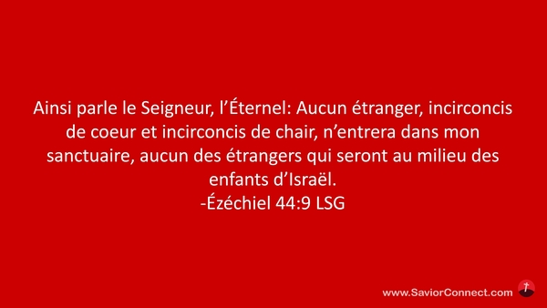 Ainsi parle le Seigneur, l'Éternel: Aucun étranger, incirconcis de coeur et incirconcis de chair, n'entrera dans mon sanctuaire, aucun des étrangers qui seront au milieu des enfants d'Israël. -Ézéchiel 44:9 LSG