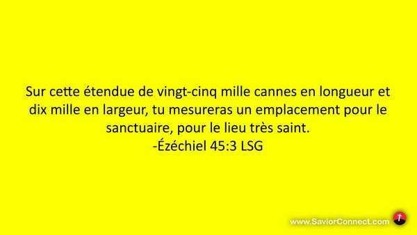 Sur cette étendue de vingt-cinq mille cannes en longueur et dix mille en largeur, tu mesureras un emplacement pour le sanctuaire, pour le lieu très saint. -Ézéchiel 45:3 LSG
