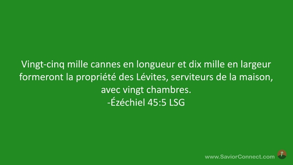 Vingt-cinq mille cannes en longueur et dix mille en largeur formeront la propriété des Lévites, serviteurs de la maison, avec vingt chambres. -Ézéchiel 45:5 LSG