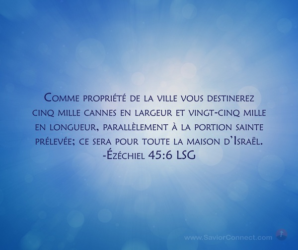 Comme propriété de la ville vous destinerez cinq mille cannes en largeur et vingt-cinq mille en longueur, parallèlement à la portion sainte prélevée; ce sera pour toute la maison d'Israël. -Ézéchiel 45:6 LSG