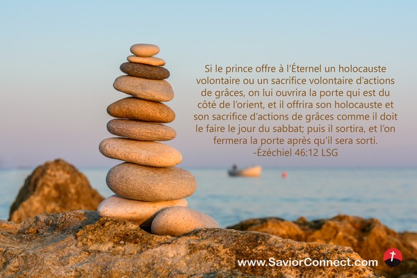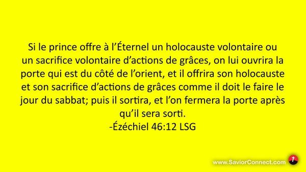 Si le prince offre à l'Éternel un holocauste volontaire ou un sacrifice volontaire d'actions de grâces, on lui ouvrira la porte qui est du côté de l'orient, et il offrira son holocauste et son sacrifice d'actions de grâces comme il doit le faire le jour du sabbat; puis il sortira, et l'on fermera la porte après qu'il sera sorti. -Ézéchiel 46:12 LSG
