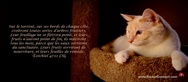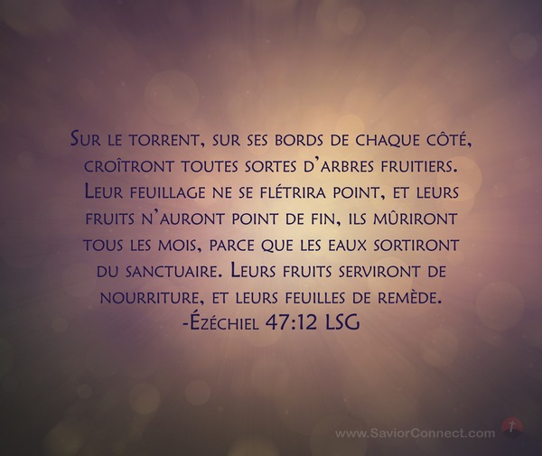 Sur le torrent, sur ses bords de chaque côté, croîtront toutes sortes d'arbres fruitiers. Leur feuillage ne se flétrira point, et leurs fruits n'auront point de fin, ils mûriront tous les mois, parce que les eaux sortiront du sanctuaire. Leurs fruits serviront de nourriture, et leurs feuilles de remède. -Ézéchiel 47:12 LSG