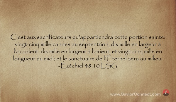 C'est aux sacrificateurs qu'appartiendra cette portion sainte: vingt-cinq mille cannes au septentrion, dix mille en largeur à l'occident, dix mille en largeur à l'orient, et vingt-cinq mille en longueur au midi; et le sanctuaire de l'Éternel sera au milieu. -Ézéchiel 48:10 LSG