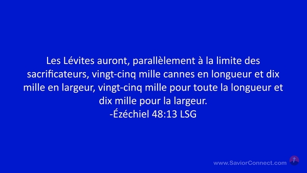 Les Lévites auront, parallèlement à la limite des sacrificateurs, vingt-cinq mille cannes en longueur et dix mille en largeur, vingt-cinq mille pour toute la longueur et dix mille pour la largeur. -Ézéchiel 48:13 LSG