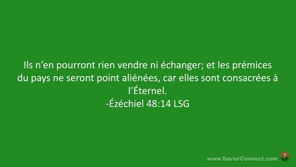 Ils n'en pourront rien vendre ni échanger; et les prémices du pays ne seront point aliénées, car elles sont consacrées à l'Éternel. -Ézéchiel 48:14 LSG