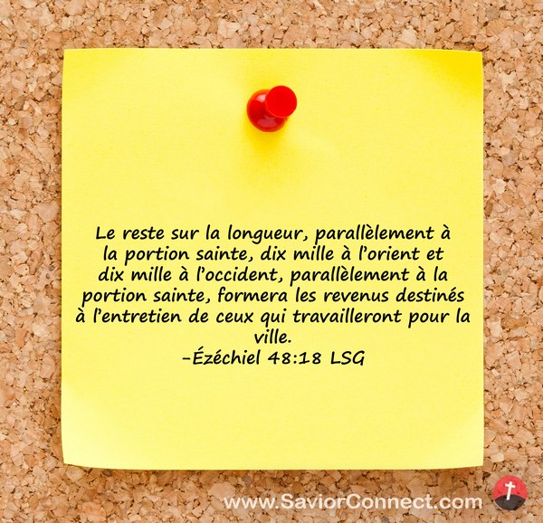 Le reste sur la longueur, parallèlement à la portion sainte, dix mille à l'orient et dix mille à l'occident, parallèlement à la portion sainte, formera les revenus destinés à l'entretien de ceux qui travailleront pour la ville. -Ézéchiel 48:18 LSG