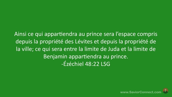 Ainsi ce qui appartiendra au prince sera l'espace compris depuis la propriété des Lévites et depuis la propriété de la ville; ce qui sera entre la limite de Juda et la limite de Benjamin appartiendra au prince. -Ézéchiel 48:22 LSG