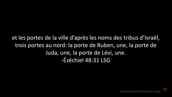 et les portes de la ville d'après les noms des tribus d'Israël, trois portes au nord: la porte de Ruben, une, la porte de Juda, une, la porte de Lévi, une. -Ézéchiel 48:31 LSG