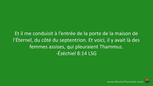 Et il me conduisit à l'entrée de la porte de la maison de l'Éternel, du côté du septentrion. Et voici, il y avait là des femmes assises, qui pleuraient Thammuz. -Ézéchiel 8:14 LSG