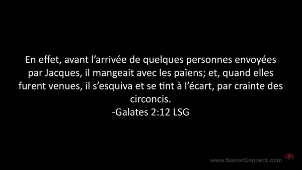 En effet, avant l'arrivée de quelques personnes envoyées par Jacques, il mangeait avec les païens; et, quand elles furent venues, il s'esquiva et se tint à l'écart, par crainte des circoncis. -Galates 2:12 LSG