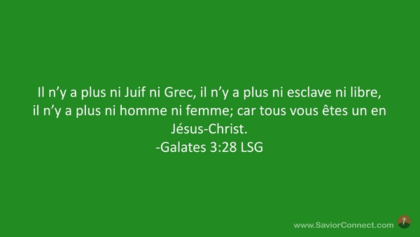 Il n'y a plus ni Juif ni Grec, il n'y a plus ni esclave ni libre, il n'y a plus ni homme ni femme; car tous vous êtes un en Jésus-Christ. -Galates 3:28 LSG