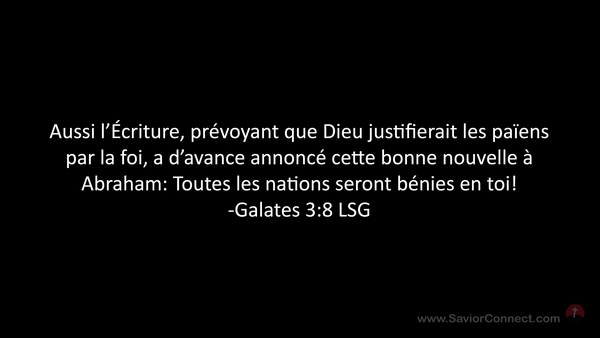 Aussi l'Écriture, prévoyant que Dieu justifierait les païens par la foi, a d'avance annoncé cette bonne nouvelle à Abraham: Toutes les nations seront bénies en toi! -Galates 3:8 LSG