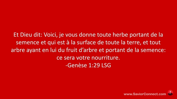Et Dieu dit: Voici, je vous donne toute herbe portant de la semence et qui est à la surface de toute la terre, et tout arbre ayant en lui du fruit d'arbre et portant de la semence: ce sera votre nourriture. -Genèse 1:29 LSG