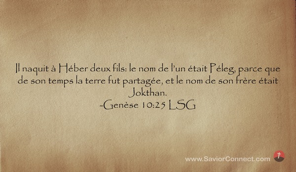 Il naquit à Héber deux fils: le nom de l'un était Péleg, parce que de son temps la terre fut partagée, et le nom de son frère était Jokthan. -Genèse 10:25 LSG