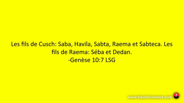 Les fils de Cusch: Saba, Havila, Sabta, Raema et Sabteca. Les fils de Raema: Séba et Dedan. -Genèse 10:7 LSG