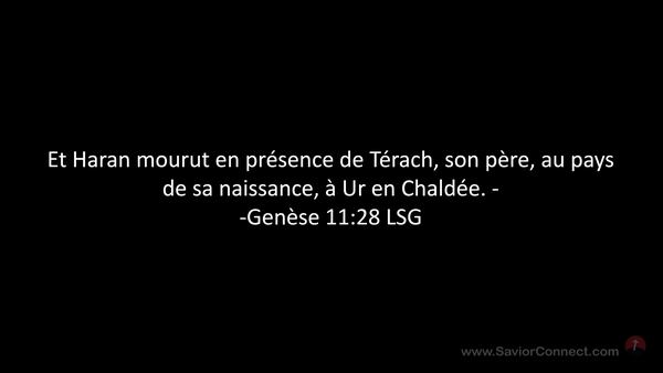 Et Haran mourut en présence de Térach, son père, au pays de sa naissance, à Ur en Chaldée. - -Genèse 11:28 LSG