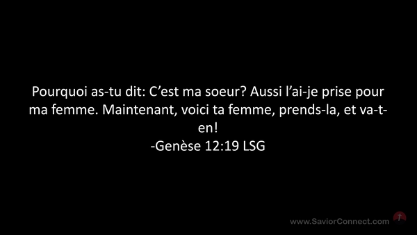 Pourquoi as-tu dit: C'est ma soeur? Aussi l'ai-je prise pour ma femme. Maintenant, voici ta femme, prends-la, et va-t-en! -Genèse 12:19 LSG