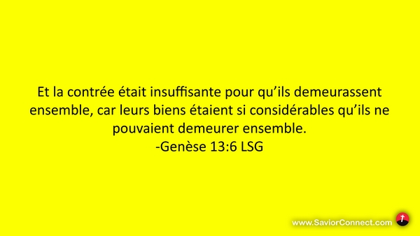 Et la contrée était insuffisante pour qu'ils demeurassent ensemble, car leurs biens étaient si considérables qu'ils ne pouvaient demeurer ensemble. -Genèse 13:6 LSG