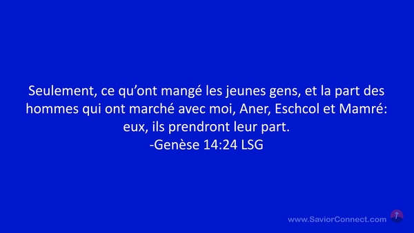 Seulement, ce qu'ont mangé les jeunes gens, et la part des hommes qui ont marché avec moi, Aner, Eschcol et Mamré: eux, ils prendront leur part. -Genèse 14:24 LSG