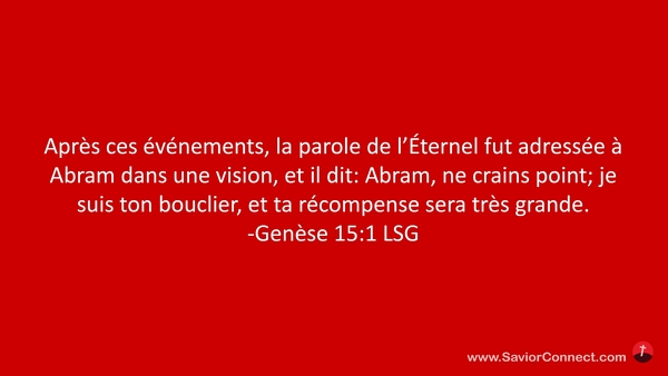 Après ces événements, la parole de l'Éternel fut adressée à Abram dans une vision, et il dit: Abram, ne crains point; je suis ton bouclier, et ta récompense sera très grande. -Genèse 15:1 LSG