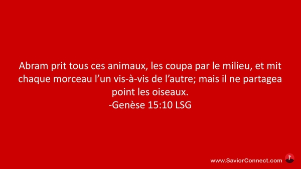 Abram prit tous ces animaux, les coupa par le milieu, et mit chaque morceau l'un vis-à-vis de l'autre; mais il ne partagea point les oiseaux. -Genèse 15:10 LSG