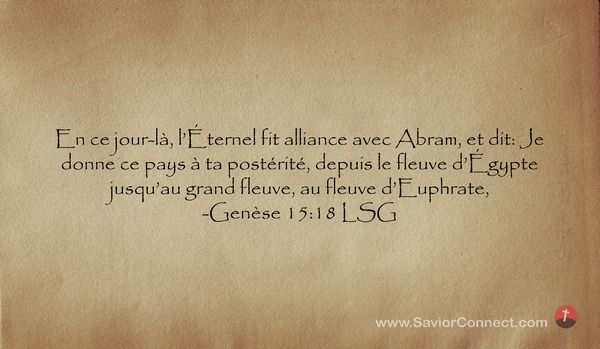 En ce jour-là, l'Éternel fit alliance avec Abram, et dit: Je donne ce pays à ta postérité, depuis le fleuve d'Égypte jusqu'au grand fleuve, au fleuve d'Euphrate, -Genèse 15:18 LSG