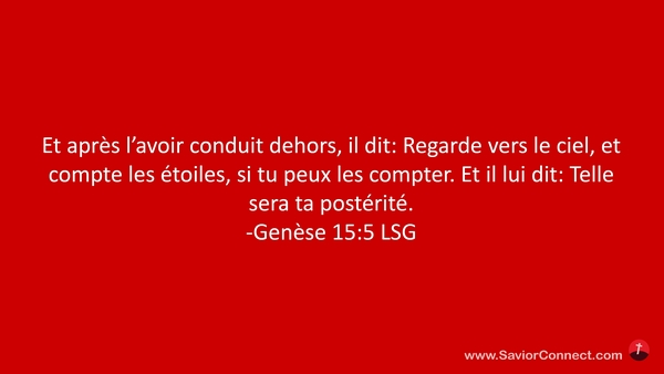 Et après l'avoir conduit dehors, il dit: Regarde vers le ciel, et compte les étoiles, si tu peux les compter. Et il lui dit: Telle sera ta postérité. -Genèse 15:5 LSG