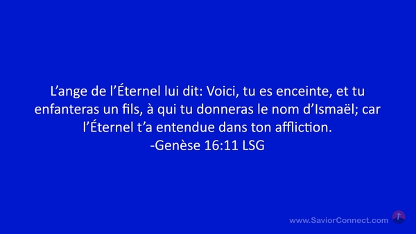 L'ange de l'Éternel lui dit: Voici, tu es enceinte, et tu enfanteras un fils, à qui tu donneras le nom d'Ismaël; car l'Éternel t'a entendue dans ton affliction. -Genèse 16:11 LSG