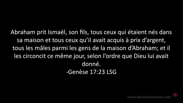 Abraham prit Ismaël, son fils, tous ceux qui étaient nés dans sa maison et tous ceux qu'il avait acquis à prix d'argent, tous les mâles parmi les gens de la maison d'Abraham; et il les circoncit ce même jour, selon l'ordre que Dieu lui avait donné. -Genèse 17:23 LSG
