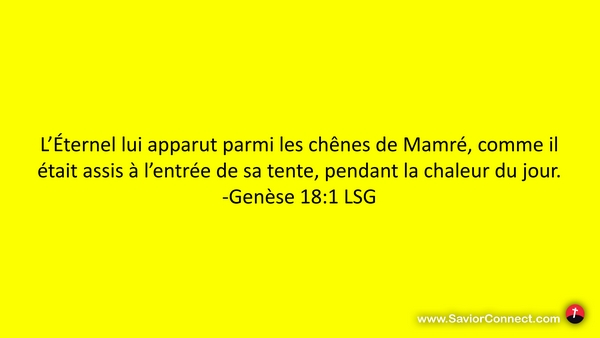 L'Éternel lui apparut parmi les chênes de Mamré, comme il était assis à l'entrée de sa tente, pendant la chaleur du jour. -Genèse 18:1 LSG