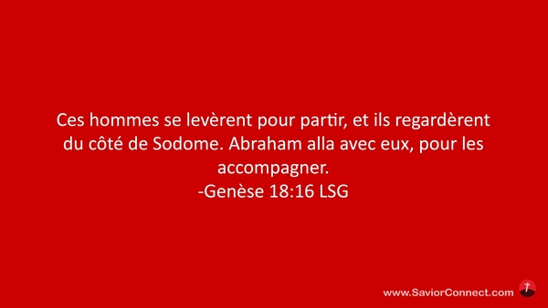 Ces hommes se levèrent pour partir, et ils regardèrent du côté de Sodome. Abraham alla avec eux, pour les accompagner. -Genèse 18:16 LSG