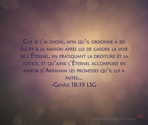 Car je l'ai choisi, afin qu'il ordonne à ses fils et à sa maison après lui de garder la voie de l'Éternel, en pratiquant la droiture et la justice, et qu'ainsi l'Éternel accomplisse en faveur d'Abraham les promesses qu'il lui a faites... -Genèse 18:19 LSG