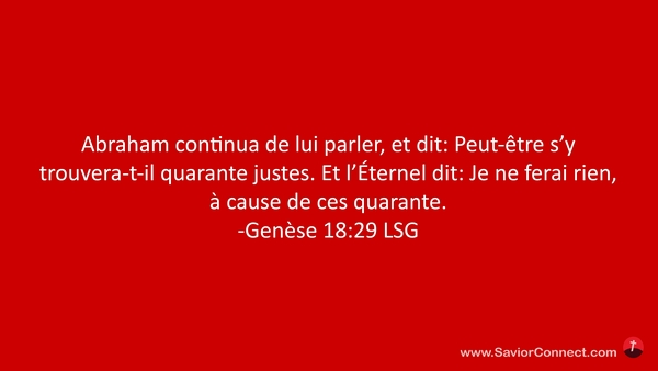 Abraham continua de lui parler, et dit: Peut-être s'y trouvera-t-il quarante justes. Et l'Éternel dit: Je ne ferai rien, à cause de ces quarante. -Genèse 18:29 LSG